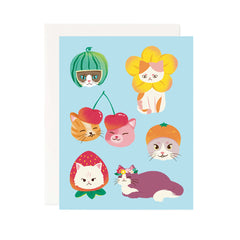 These feline fruit friends are ready to add a touch of sweetness to any occasion. The vibrant illustrations capture the essence of joy and light-heartedness, making it an ideal card for cat lovers, fruit enthusiasts, or anyone in need of a cheerful pick-me-up. Blank inside for a personal written message.